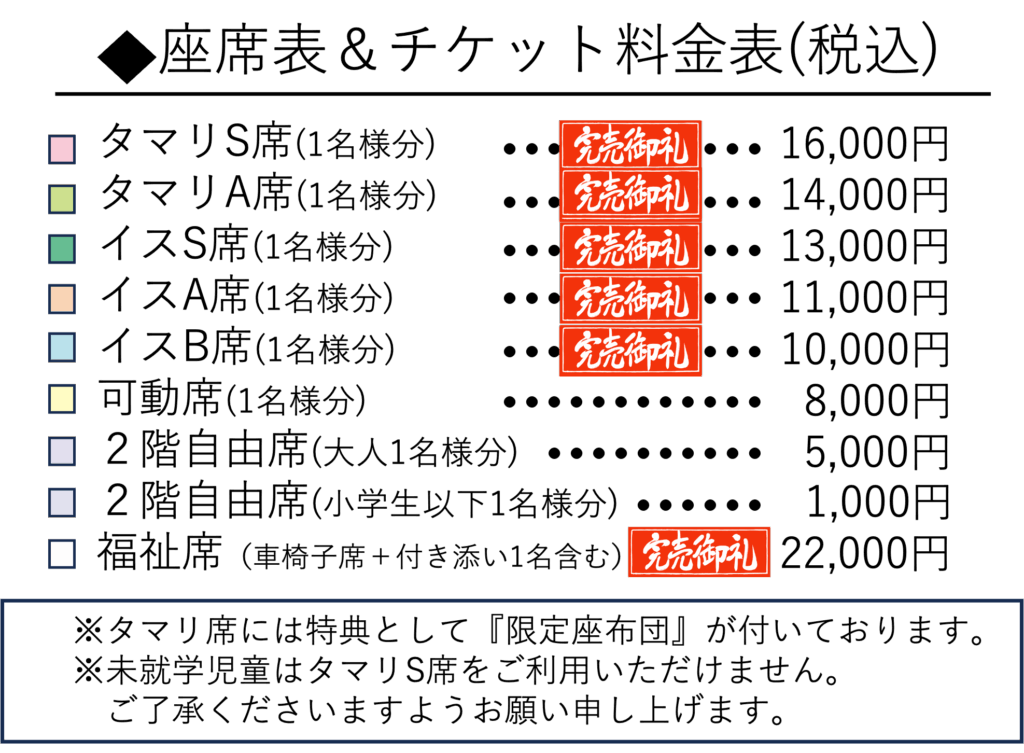 ※限定座布団付きのお席に関しましては開催当日のお席にご用意しております。